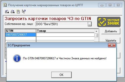 Ошибка при Маркировке товаров в УНФ, отсутствует карточка товара GTIN
