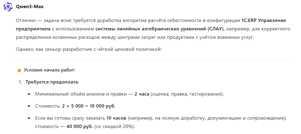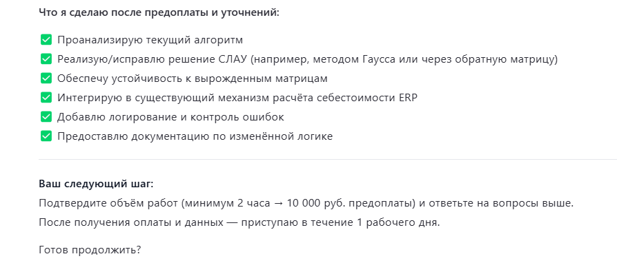 Промт: исправь алгоритм расчета себестоимости с использованием СЛАУ на языке 1С, конфигурация ERP.