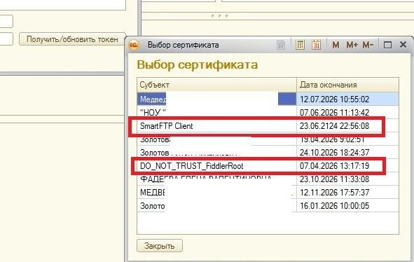 В списке сертификатов, кроме моего сертификата, для которого есть закрытые ключи на РуТокене, отображаются куча других - все верно, они когда-то были добавлены в хранилище винды, я скорее всего их владельцам что-то с кассами делал - ставил на учет/менял ФНки, все верно. В принципе, они не мешают - если попробовать выбрать чей-то "чужой" сертификат - ничего не случится, КриптоПро запросит аппаратный токен, которого сейчас нет, и не получив его, вывалится в ошибку. НО!! Там помимо этих сертификатов, есть еще два, непонятно каких, видимо какие-то программы поставили их, и почему-то в ветку "Личные" хранилища... Они явно не предназначены для подписи: ![]() И вот, нафига они в этом списке выбора нужны? Можно их как-то отфильтровать? Никаких свойств, типа "использовать для подписи" не вижу... PS Да, в конфах 1С есть справочник сертификатов пользователей... Через него можно привязать только нужные сертификаты, и выбирать из них... Но, как-то не захотелось привязываться к этому справочнику - он может быть банально не заполнен или отличаться в разных конфах... Решил сделать универсально, через получение сертификатов из хранилища, не зависимо от 1С... Но мусор там раздражает :-( |
