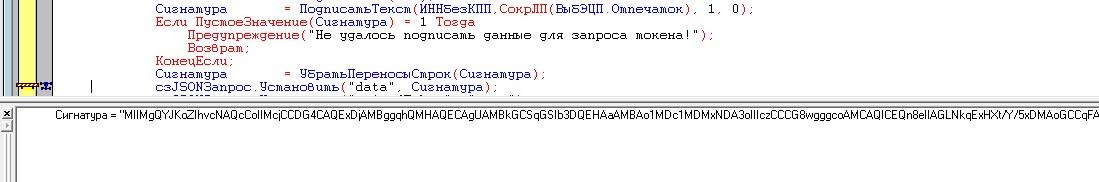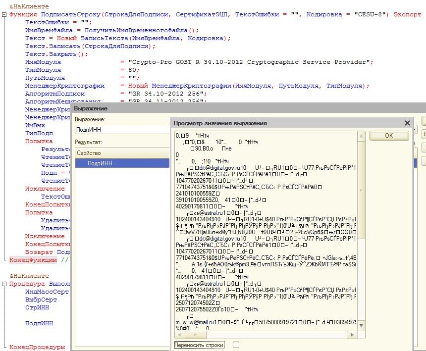 КонецФункцииВызов этого: &НаКлиенте Функция ПодписатьСтроку(СтрокаДляПодписи, СертификатЭЦП) Экспорт // Здесь СертификатЭЦП - сертификат полученный в 1С через МенеджерКриптографии, ИМХО - лишнее, упрощу потом... Отпечаток = СертификатЭЦП.Отпечаток; Подп = ПодписатьТекстЦРПТ(СтрокаДляПодписи, Отпечаток, Ложь); // третий параметр прикрепленная. Если нужно открепленная - то Истина Возврат Подп; КонецФункции |