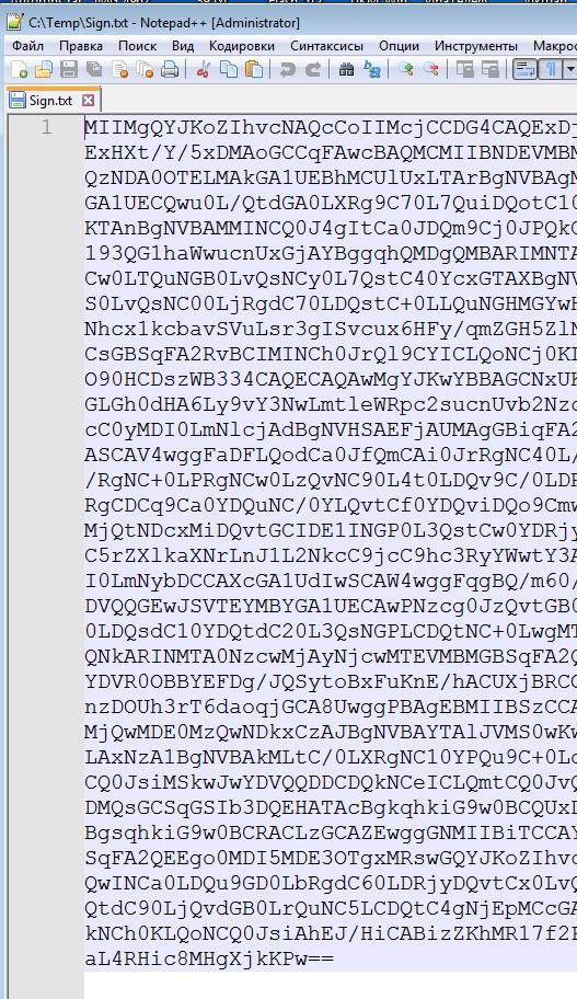Как минимум, переносы строк лишние(это на скриншоте из восьмерки):  В 7.7 у меня отдельная функция была УбратьПереносыСтрок, там вся ЭЦП одной длинной строкой... Тут отдельными строками-блоками. Но, все равно содержание разное, судя по началу и концу... Не знаю, насколько это критично... | |||