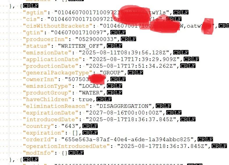 Пусто. Хотя по воде, GTIN-ы на балансе точно есть, и много. Похоже он возвращает только те GTIN, которые регистрировал сам участник оборота в "Национальном каталоге", те, что прилетели от поставщиков - не отображаются. PS Не только по воде. Ни по чем нет. К сожалению, нет сейчас ключа ни одного из клиентов, кому остатки по тапочкам и шмоткам вводил в оборот, там заводили новые, типа "для остатков" GTIN, начинающиеся на "029***"... Скорее всего, по ним инфа выведется. Ну, может попадет в руки такой токен с КЭП, проверю... Или сформирую у них скриптом "Единый токен в формате UUID", и по нему у себя смогу проверить. |