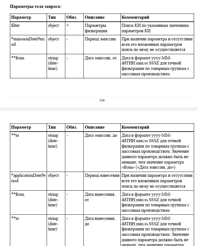 Глючный этот запрос :-( Надеюсь, что "пока". Странно влияет секция JSON тела запроса, отвечающая за страничный вывод :-(, пагинация: "pagination". То, что в (40) писал: "там всего 100 КИЗов(почему 100? в параметре пагинации 1000 задал)", это был мой косяк, ошибся, и эту секцию внутрь секции "фильтр" засунул, поэтому и она не работала, выводила 100 кодов по умолчанию, и не реагировала на параметр "perPage". При этом, как ни странно - ошибку не давало, хотя по описанию раздел "pagination" обязательный... Но, что самое странное - после того, как поправил, перестало выводить список марок по тоу GTIN, с которого начинал все свои "эксперименты". Выводит, что по нему кодов 0. Комментирую раздел пагинации - по этому коду марки выводятся, 23 штуки, 2 в обороте... Если вернуть раздел пагинации на место, то, если в фильтре убрать параметр GTIN, то прилетает список 112 марок, типа по всем GTIN. Но, в списке, нет марок по этоому GTIN-!!! Без пагинации, по этому GTIN марки возвращаются... Вот как так? Как этот параметр может быть связан с конкретным GTIN - ??? По идее, он должен влиять только на страничный вывод, и ни как не влиять на результаты запроса. Иначе, как глюками, я это объяснить не могу... Бред какой-то, но факт :-( |